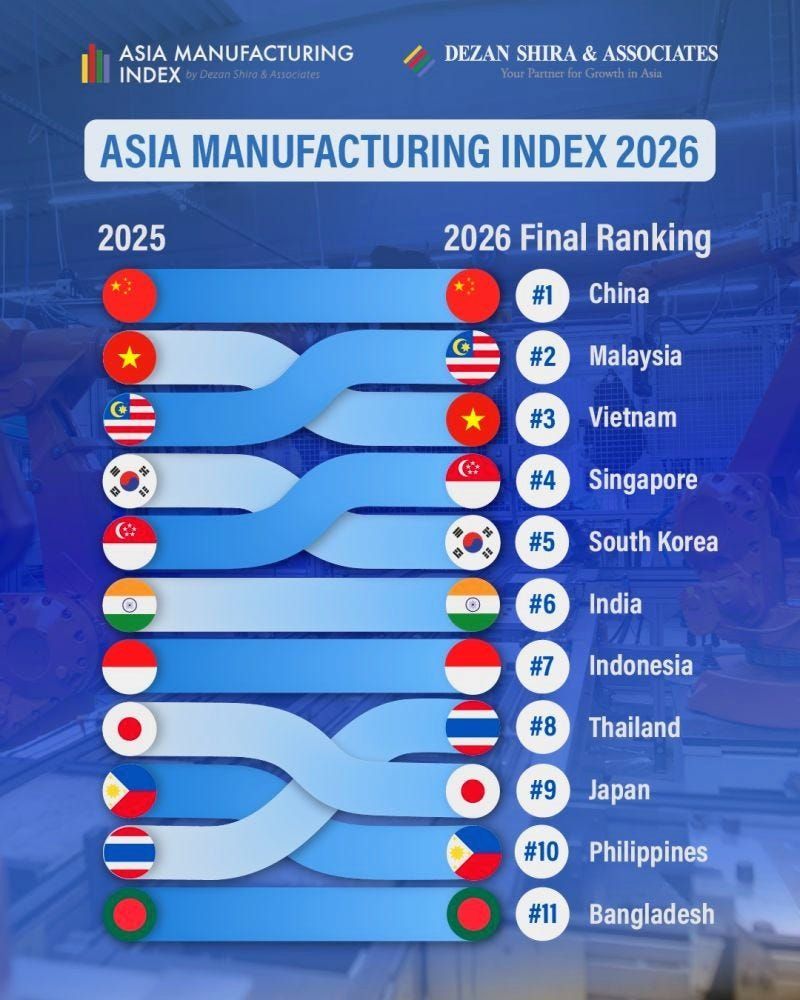 The 2026 Asia Manufacturing Index published by Dezan Shira & Associates ranks Malaysia second overall among the 11 Asian economies included in the index. Among ASEAN economies, Malaysia is positioned ahead of Vietnam, Singapore, Thailand, Indonesia, and the Philippines based on the index’s final ranking.
