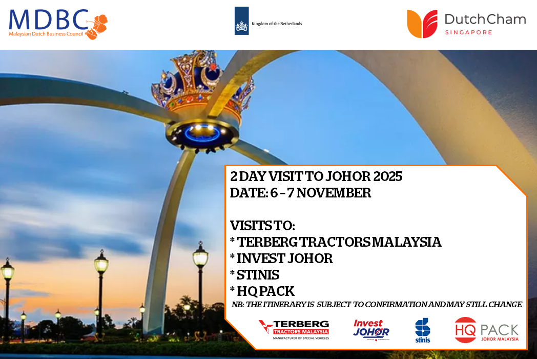 The Malaysian Dutch Business Council (MDBC) has the pleasure of inviting members of MDBC and DutchCham Singapore to a two day program in Johor. This is organized by MDBC in close cooperation with the Embassy of the Kingdom of the Netherlands to Malaysia.  Available space is limited, registration is required.