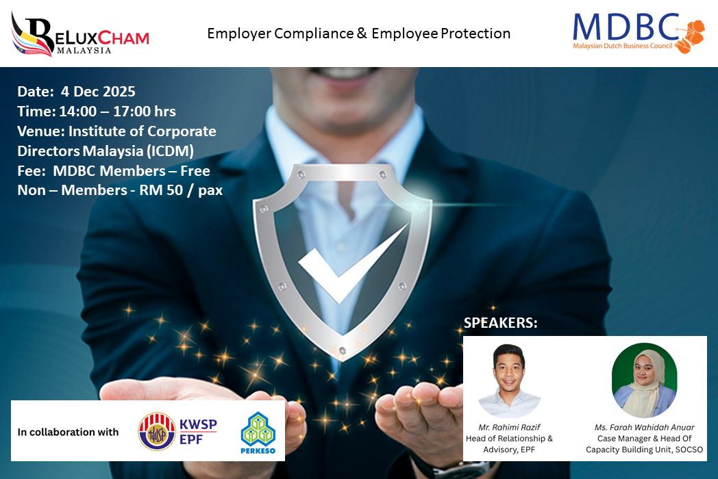 We are pleased to invite you to an exclusive information session organized by BeluxCham Malaysia, KWSP / EPF, and Perkeso. Supported by MDBC, this event will feature expert speakers from the Employees Provident Fund (EPF) and the Social Security Organization (SOCSO). This joint EPF and SOCSO presentation provides employers and HR professionals with essential updates on statutory obligations and employee protection schemes.